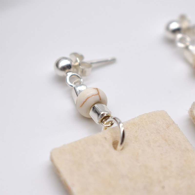 Pensées et conçues sur les bases du Feng Shui de la forme, élément Terre, elles se composent de carrés en tissu végétalien (textile végan naturel en fibre d’ananas certifié B Corp), de perles en céramique couleur blanc cassé, de perles et d’apprêts en argent 925 (poinçon) de grande qualité dont 30% minimum est recyclé et de colle naturelle végane.